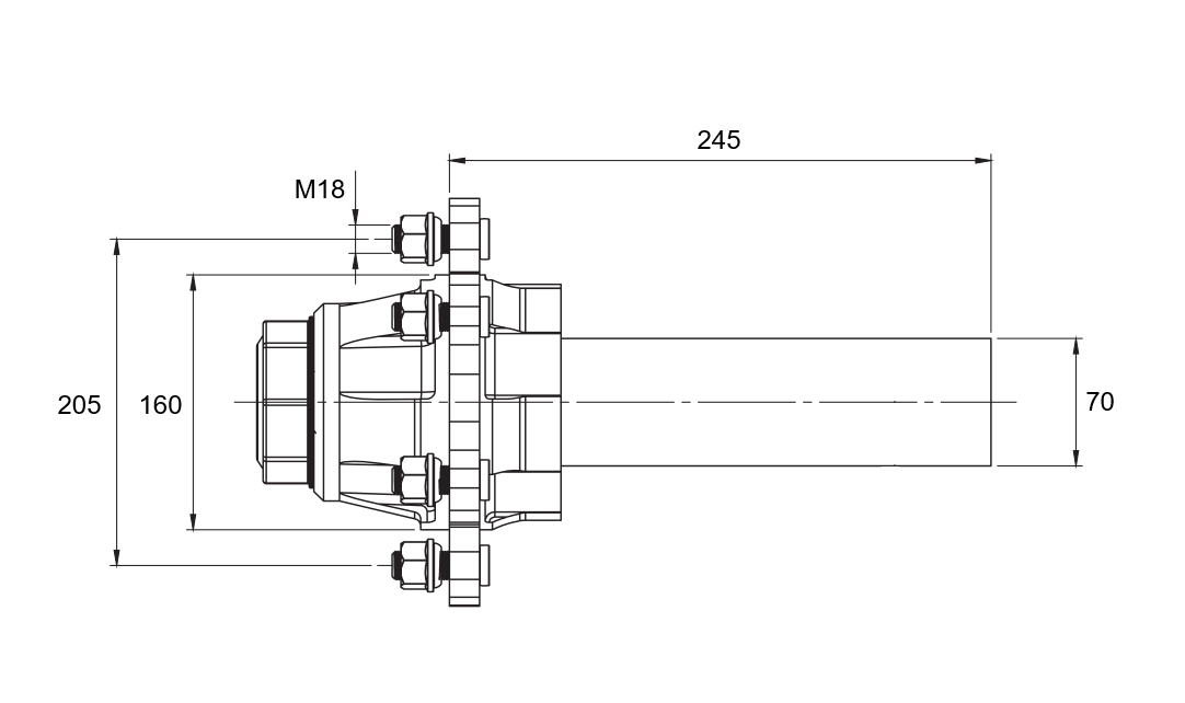 The unbraked stub axle is intended for use on various types of trailers without a braking system. The stub axle length is 245 mm, with a load capacity of up to 3600 kg.